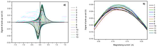 The condition of the surface (possible dirt on the surface) or the different position of magnetizing yoke with respect to the sample surface can cause an error in the measured permeability loops. To check this possible source of error after repeating the measurements electronically (see above), the magnetizing yoke was removed from the sample surface, put back, and the measurement was repeated several times in a row. In this case, the repeatability of the measurement was also very good, although slightly worse than the previous case. The typical series of permeability loops after repositioning of magnetizing yoke are shown, again as an illustration, in Figure A2. The same was experienced in all of the measured samples by analyzing the results of many measurements. It can be stated that by using this procedure, the measurement error itself is also almost negligible, similarly to the electronic error.