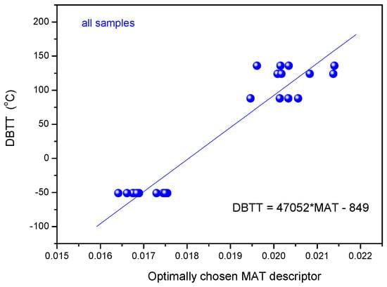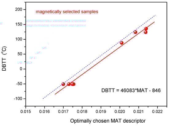 If the estimation is done based on measurements of magnetically selected samples, the fitted linear function is: DBTT = 46083*MAT − 846, which is remarkable close to the the one in Figure 7. In Figure 8, the linear fit from Figure 7 is also shown (blue dashed line) to illustrate the situation visually. This means that even a large scatter of points does not spoil the DBTT estimation significantly. We can use the found correlation for a reliable estimation of the transition temperature. Evidently, this numerical correlation cannot be generalized and it is not valid for different materials and conditions. Instead, these numbers are given only for a comparison in case of our present measurements.