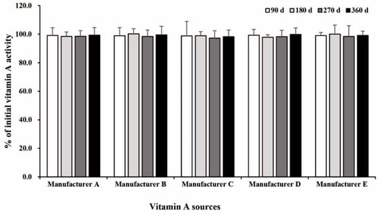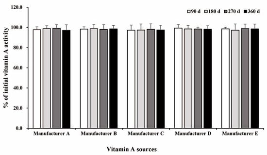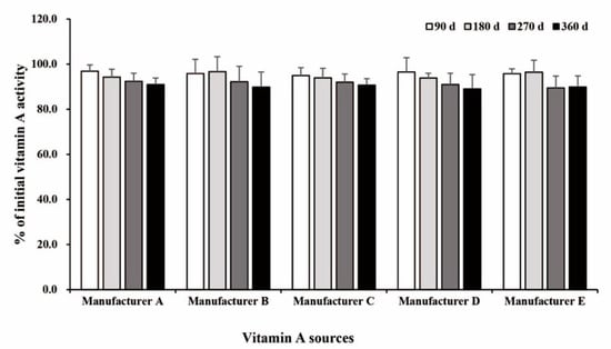 Each vitamin A product was added and mixed with either three vitamin premixes or three vitamin-trace mineral (VTM) premixes (Table 1). The amount added for each vitamin A product was determined such that including 0.30% vitamin premix or 1% VTM premix in the diet would provide the activity of vitamin A commonly used in pig diets (15,000 IU/kg for suckling pig, 12,000 IU/kg for weanling pig, and 8,000 IU/kg for finishing pig). Vitamin or VTM premixes were mixed at the designed levels with each vitamin A source, which were mixed using a paddle mixer for 5 min. The preparations of vitamin and VTM mineral premixes are described previously []. This process was repeated to yield six replicates per treatment. Vitamin premixes were stored in a controlled environment chamber setting at 25 °C and 60% relative humidity. The VTM premixes were stored in a storage room (approximately 22 °C). At sampling, each sample bag was pulled out at d 0, 90, 180, 270, and 360, and samples were sent immediately after collection to the Ministry of Agriculture and Rural Affairs Feed Efficacy and Safety Evaluation Center (Beijing, China) for vitamin A analysis using a slight modification of the AOAC official method (AOAC 2012.10) []. The stability of vitamin A in vitamin premixes and VTM premixes during storage was reported as the residual vitamin activity (% of initial) at each sampling point.