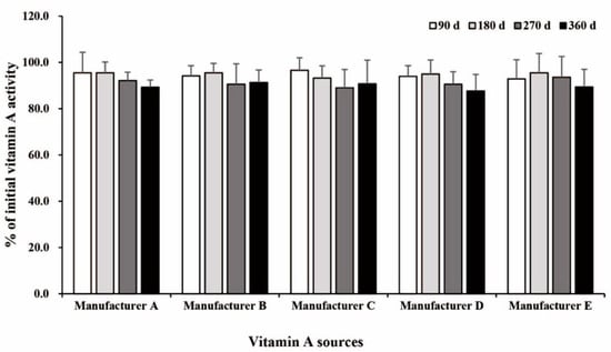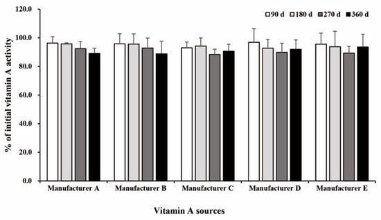 The stability of commercially available vitamin A during storage is affected by storage time regardless of vitamin A source. Vitamin A stored in a vitamin premix was the most stable. In VTM premixes, longer storage times reduced vitamin A activity, but vitamin A sources from different manufacturers have the same stability during storage.