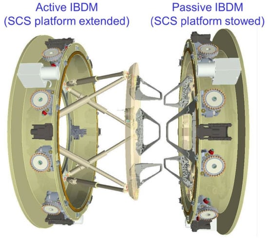 The Berthing Docking Mechanism (BDM) is a mechatronic system that is capable of performing successful rendezvous/contact operations via either docking or berthing. It is designed for the low-impact docking of a spacecraft by actively reducing the impact forces on the platform during progressive contact. The structural design of the BDM is a 6DOF parallel manipulator, based on the Stewart–Gough platform [,]. Lab-scale 6DOF Stewart systems controlled with robust integer-order controllers have already been presented in [,,,]. However, the main difference to the lab-scale application is that BDM structures have high LPV dynamic properties. Since the leg’s dynamics depend on the experienced inertial load, each relative mass corresponds to a model with different dynamics. In other words, each model represents the dynamics of a particular leg in a particular pose when a certain force is exerted on the platform’s upper ring. Since every executable trajectory of the platform can be seen as a succession of different states, it is clear that the LEMA dynamics change constantly during spacecraft docking. How they become active during the contact process is briefly described as follows. During docking, the mechanism consists of an active and a passive module, as illustrated in Figure 1, which can be viewed as two sub-systems with an interaction when in contact.