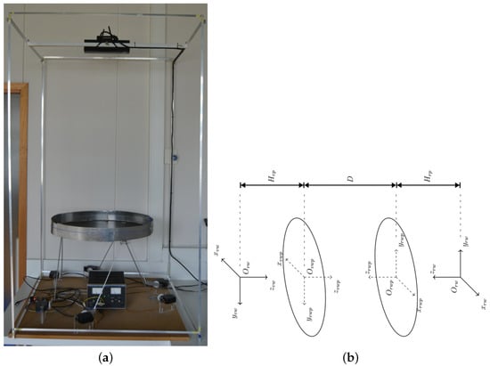(a) Real world six degree of freedom (6DOF) platform for co-simulation, including a frame and Kinect IR-camera; (b) Relation between coordinate systems of the real world and the virtual world.