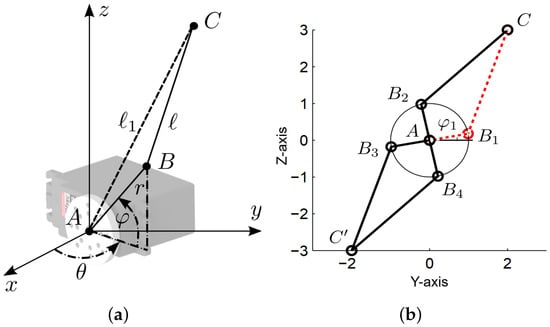 which are illustrated in Figure 3b. Due to the employed mathematical method, a second point is found; thus, solutions and (for points and ) are discarded. Solution and (for points and ) brings the connection C to its desired position. As the servo position is restricted between , solution (point ) is selected as the unique feasible solution. The closed loop control uses classical visual feedback control based on camera vision information, as described in [].