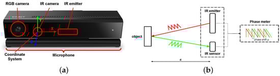 (a) The coordinate system of the Kinect v2 camera and the location of the sensors []; (b) time-of-flight (ToF) principle used in the Kinect sensor. The sent and received signal are compared to each other in order to determine the phase change and calculate the distance.