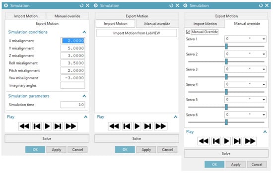 - Export motion is used to configure the attitude and position of the virtual platform. The values of servomotors are written in the text box besides the imaginary angles while filling in the values for the platform orientation—this makes it so that the values can still be adjusted before starting the solution. The simulation time defines the duration of the simulation;