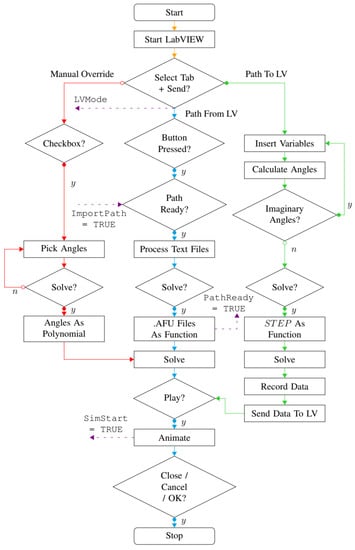 The overview of these three operating modes is illustrated in the flowchart in Figure 6, where the red path represents the manual override mode, the blue path represents the import motion mode and the green path represents the export motion mode. The purple dash arrows represent the registry keys (SimStart, PathReady, LVMode, ImportPath) that are used to communicate with the LabVIEW application and ensure that the LabVIEW program does not skip steps the next time it executes. The overview of the working application (Figure 6) shows the main steps in the communication and data processing parts necessary to allow the real-time co-simulation of the real world and virtual world platform setups as part of the docking mechanism.