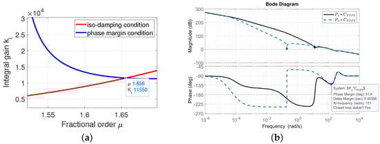 (a) The cross-section point of the phase margin and iso-damping criteria; (b) a Bode diagram of the open loop system in the two extreme cases.