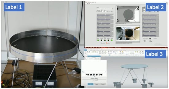 An example of a co-simulation interface and real-time tracking between the 6DOF platform and virtual model is illustrated in Figure 8. In this figure, the real world platform can be observed, including the active part of the BDM system (label 1), the front panel of the LabVIEW application (label 2) and the 3D model of the simulated platform (label 3).