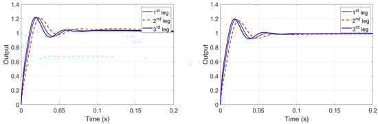 Step responses for the adaptive controller for three legs for the first case, (left), and the second case, (right).