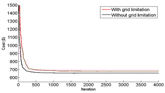 Comparison of cost convergence with and without the limitations of upstream power exchange.