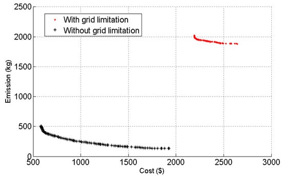 Comparison of Pareto Fronts with and without limitation of upstream grid exchange (cost and emission based).