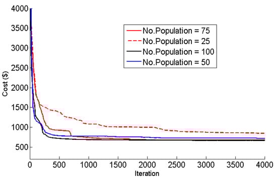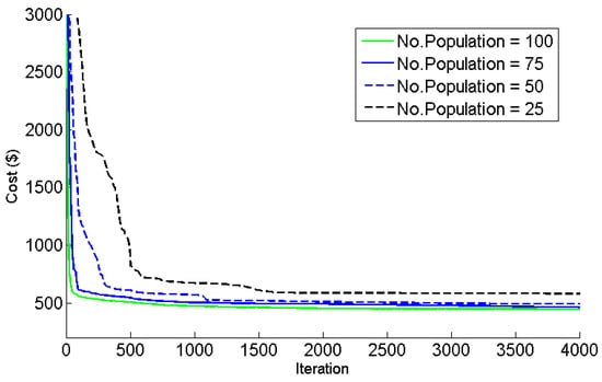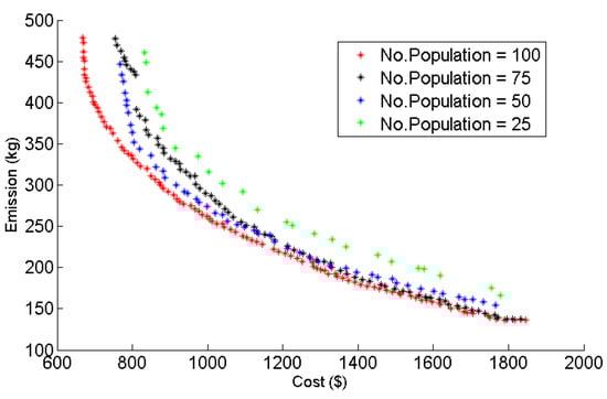 In order to show the sensitivity, the algorithm has been implemented to solve the issue of optimal number of populations in the problem of optimal operation of MG with different initial populations in two single-objective and multi-objective modes. Populations of 25, 50, 75, and 100 are intended to solve the problem. Table 20 shows the impact of population change on cost and Table 21 displays the impact of initial population on pollution. Increasing the initial population has improved the answers. On the other hand, the running time of the program also increases. Figure 13 and Figure 14 show the effects of the initial population on convergence respectively. It is clear that increasing population size improves the convergence of graphs. Figure 15 shows the Pareto Fronts with different populations; an increase in population makes the Fronts more dominant.