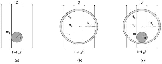 The geometry of spherical (a) conductive object, (b) thin enclosure, and (c) hidden spherical object in thin enclosure using z-directed uniform magnetic field with amplitude. An inside conductive object has radius and induces magnetic dipole (). The spherical shell has an outer radius and thickness. The incident field () induces magnetic dipole () and is scattered ().