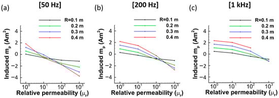 The amplitude () of induced magnetic dipoles on sphere objects with various relative permeability at 50 Hz, 200 Hz, and 1 kHz. A radius of the sphere object is verified from 0.1 to 0.4 m.