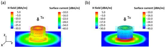 Figure 3 shows the fields and induced surface current for (a) conductive and (b) ferromagnetic cylinders in the presence of a 50 Hz magnetic dipole transmitter. The relative permeabilities of the conductive and ferromagnetic cylinders are 1 and 1000. The cylinders have a 0.2 m radius and 0.2 m height with 106 S/m conductivity. The center of the bottom of the cylinders is . The incident magnetic field is assumed as a negative z-oriented uniform and perpendicular magnetic field on cylinder materials. Figure 3a shows that a counterclockwise directional surface current on the conductive cylinder is induced. With the induced Eddy current, the illuminating magnetic field is blocked, and the field amplitude is reduced 3 dB compared to around the corner of the cylinder radius (). However, Figure 3b shows that a clockwise directional surface current on the ferromagnetic cylinder is induced. The illuminating magnetic field is gathered and the field amplitude is enhanced 3 dB compared to the boundary area at and . This result shows the important phenomenon that high conductivity and high permeability have opposing effects. Specifically, a purely conductive object results in a magnetic depletion; i.e., the object essentially blocks the incident magnetic field. However, a purely permeable object focuses the field and creates an enhancement. The direction of the currents is dependent on a phase of the incident field in time and is opposite when a phase of the field is 180 degrees. For the non-magnetic object, the induced current has approximately the same phase as the incident field. For the magnetic object, the current is 180 degrees out of the phase with the incident field. For an object with mixed properties, this results in a complex dependence on the size, permeability, and conductivity of the object as alluded by Equation (2). However, the problem becomes considerably more complex with the introduction of an external shield.