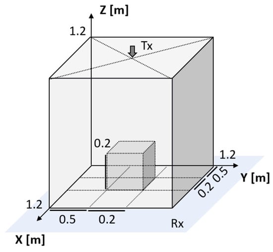 Figure 4 shows an illustration of FEKO simulation setup with a hidden box inside a thin-shelled cubic shield. The system is illuminated by an infinitesimal point magnetic dipole that is oriented in the negative z direction with amplitude . The side lengths of the outside shell are set at 1.2 m, and the hidden box is located at . The thickness of the outside shell is 2.7 mm. The size and location of the outside shell are fixed in all cases. The outside shell was utilized and designed in recent previous experiments [7,8]. The transmitting magnetic dipole is located at m and m. The frequency of the dipole is 50 Hz, which is on the low end of the ELF/VLF band. Fifty and 60 Hz are commonly used by much of the world as power line operational frequencies. Utilizing 50 Hz allows us to indirectly investigate the potential of using background power line signals for ELF imaging. Furthermore, the 50 Hz frequency most clearly shows the hidden objects because of the inherently high degree of penetration [8]. The 200 Hz and 1 kHz cases also have similar qualitative field profiles due to distortions from the hidden objects; however, the incident signal-to-noise ratio (SNR) is notably higher. All electromagnetic quantities are assumed to be time harmonic and all data are calculated when the source field has zero phase . The receivers are assumed to be located on the light blue plane below the box and parallel planes below it. The locations of the transmitter, center of the inside box, and outside shell are fixed in all cases. The simulation utilizes 8770 surface elements on the box and the observation has 1 cm grid resolution.