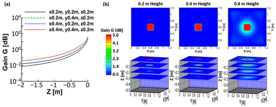 To examine the relative effects of the shield, the gain G is expressed by dB, which is the ratio of the scattered field in the absence of the hidden object to the total field in the presence of the hidden object. Figure 5 shows the gain G for different sizes of the hidden box as a function of spatial coordinates. For this set of simulations, the hidden object is assumed to be a perfect electrical conductor (PEC) in the shape of a cube. The conductivity of the outside shell is 106 S/m, and the distortion magnetic fields are measured at the negative z-direction. Figure 5a shows the gain fall-off with receiver distance for different widths and lengths of the hidden PEC box with the same height. Specifically, the gain is measured at (central axis of the system). The gain decreases with the receiver stand-off distance with an profile as expected from that of a magnetic dipole; however, notable differences are observed for the different sized objects. For instance, at , when the length () increases from 0.2 to 0.4 m, the G value increases by 2 dB (29.9 to 31.9 dB). When the area of the inside box is the same ( 0.2 m, 0.4 m vs. 0.4 m, 0.2 m), the gain values are almost the same. When the width and length increase from 0.2 to 0.4 m, the value increases 1.52 times (29.9 to 45.4 dB). At , the G value for the 0.04 m2 area is 4.6 times higher (0.0327 to 0.151 dB) than in the case of the 0.16 m2. As the stand-off distance of the receiver is increased (negative z-direction), the difference in gain between the different conditions is accentuated. This is consistent with the theoretical expectations from Section 2 where the induced magnetic dipole moment is proportional to the volume of the hidden object and the corresponding fields fall off as the cubic distance from the object’s location.