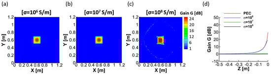 Figure 6d shows the gain when the conductivities of the hidden box are changed but the outer shell has a fixed 106 S/m conductivity. The G value is measured at the center of the plane along the negative z-direction. In the PEC case, the G value is the highest (29.6 dB) and sharply decreases along the negative z-direction. Far from , the cases of PEC and 108 S/m conductivity have the same G value. When the conductivity of the inside box decreases from 108 to 107 S/m, the G value is reduced from 19.2 to 0.9 dB. For a conductivity of 106 S/m, the G value is 0. This suggests that the object is not easily detectable when the conductivity of both inside and outside boxes is the same. This suggests that ELF/VLF magnetic fields have difficulty discerning hidden objects when the conductivity contrast is not appreciably high and is an important limitation of the method.