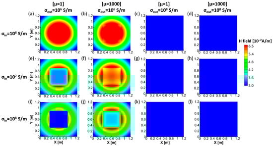 Figure 7 shows that the fields are measured on the plane at for conductive () and ferromagnetic () materials through an outer shell at 50 Hz case. The inside objects in cube geometry have a length of 0.6 m with S/m conductivity. The outer shells have 2.7 mm thickness with S/m conductivity. The size of the outer shells and the location of magnetic dipoles are the same as shown in Figure 4. Compared to only inside materials in Figure 2 and Figure 3, there is a conductive outer shell. When an outer shell has lower conductivity than an inside object, the size and location of the inside object can be imaged as shown in Figure 7e,f,i,j. From the boundary of the inside box, the magnetic fields decrease when the measurement point goes to the center ().