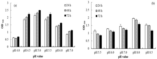 Effects of pH on the AuNPs synthesized by (a) B. lactis and (b) E. coli after 24, 48, and 72 h of incubation.