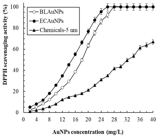 Free radicals cause damage and mutation of human cells, and antioxidants play a crucial role in fighting them. The antioxidant activity of chemicals is often evaluated by measuring the DPPH radical scavenging activity [31]. Figure 3 indicates that the DPPH radical scavenging activity increases as the concentration of AuNPs increases. A similar dose-dependent behavior was observed among AuNPs biosynthesized using thyme extract [32]. Scavenging activities of 92.5%, 100%, and 35% were achieved for BLAuNPs, ECAuNPs, and Chemicals–5 nm, respectively, at 26 mg/L. The IC50 values of BLAuNPs, ECAuNPs, and Chemicals–5 nm were calculated as 18.2, 14.8, 32.4 mg/L, respectively. The results showed that biosynthesized AuNPs exhibited higher antioxidant activity than chemically synthesized AuNPs. IC50 values for DPPH radical scavenging activity of AuNPs synthesized by Albizia amara [33], Prunus persica [27], Alpinia nigra [24], and P. ginseng [5] were 25.25, 92.6, 52.16, and 141.3 mg/L, respectively. Compared with these biogenic AuNPs, ECAuNPs exhibited higher antioxidant activity. This may be because AuNPs exists in two oxidation states, Au+1 and Au+3; thus, they have a high tendency (especially AuNPs of a small particle size or coated with bioactive compounds) to accept or donate electrons or hydrogen to create a strong bond based on the existing oxidation state [34].