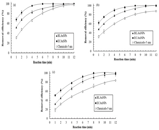 Removal efficiencies of (a) VBR (b) MG and (c) MB by BLAuNPs, ECAuNPs, and Chemicals-5 nm during the 12 min treatment periods (dye concentration: 100 mg/L; AuNPs concentration: 25 mg/L).
