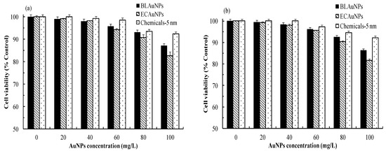 Figure 5 shows that the cytotoxicity of AuNPs to the tested cells increases as the AuNPs concentration increases. Compared with BLAuNPs, ECAuNPs were more toxic. At up to 2 × IC50 for BLAuNPs and ECAuNPs (36.4 and 29.6 mg/L, respectively), the cell viability of HEMn and CCD966SK cells still exceeded 98.0%. When the tested concentration of Chemicals-5 nm was up to 2 × MIC (100 mg/L), the cell viability exceeded 92.1%. No obvious signs of cytotoxicity were observed compared with control. In addition, the differences in the inhibition of cell viability by BLAuNPs and ECAuNPs were nonsignificant (p > 0.05) between CCD966SK and HEMn cells when the tested concentration was ≤60 mg/L. However, previous reports have indicated that AuNPs biosynthesized by Albizia amara exerted cytotoxic effects on HeLa and Vero cells, with IC50 values of 47.77 and 72.28 mg/L, respectively [33]. The IC50 of AuNPs biosynthesized by Olax nana on HepG2 cells was 2.97 mg/L [22]. Previous studies have revealed that AuNPs could be uptaken by cells through the clathrin-mediated endocytosis pathway [12,38]. Thus, the cytotoxicity of BLAuNPs and ECAuNPs to CCD966SK and HEMn cells can be prevented in a similar manner. These results clearly indicated that BLAuNPs and ECAuNPs can be safely applied in the medicine and cosmetics.