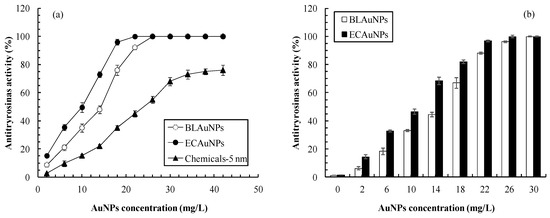 Figure 6 shows that the antityrosinase activities in mushroom and HEMn cells increase with an increase in AuNPs concentration. Regarding the in vitro antityrosinase activity against mushroom tyrosinase, the IC50 values of BLAuNPs, ECAuNPs, and Chemicals-5 nm were 14.2, 10.2, and 24.1 mg/L, respectively (Figure 6a). Moreover, the antityrosinase activity of biogenic AuNPs was superior to that of Chemicals-5 nm. It was suggested that some bioactive compounds produced by bacteria are coated on the AuNPs surface without capping agents, thereby enhancing the tyrosinase inhibition activity [38]. Furthermore, our results were more favorable than those for the control arbutin (IC50: 18.2 mg/L) and AuNPs synthesized by Panax ginseng leaves (IC50: 16.06 mg/L) [38], but inferior to that for P. ginseng berries (IC50: 6.6 mg/L) [5].
