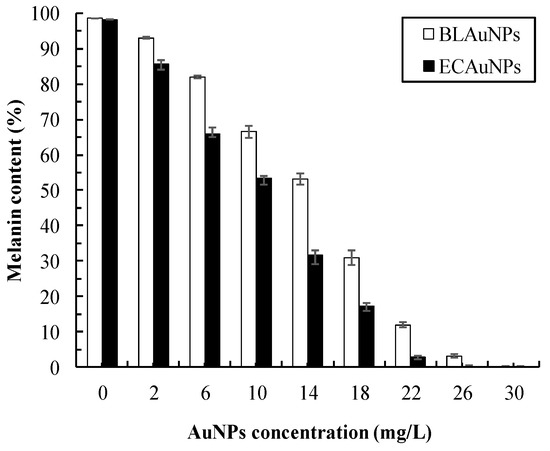 The inhibition of melanin production in HEMn cells decreased in a dose-dependent manner (Figure 7). Melanin was completely inhibited by ECAuNPs and BLAuNPs at 26 and 30 mg/L, respectively. The trend of melanin content inhibition shown in Figure 7 was similar to that of tyrosinase inhibition in shown in Figure 6b. As ECAuNPs and BLAuNPs were noncytotoxic at such concentrations (Figure 5), the inhibition of melanogenesis may be attributed to the inhibition of tyrosinase or related enzymes, rather than melanocyte death. The underlying mechanism must be confirmed through Western blotting. ECAuNPs and BLAuNPs at a concentration of 10 mg/L reduced the melanin contents in HEMn to 46.5% and 33.5%, respectively (Figure 7)—higher than the inhibitions observed when HEMn were treated with the same concentration of P. ginseng leaf-mediated AuNPs (25%) and P. ginseng berry-mediated AuNPs (16%) [5,38]. These results suggested that biogenic AuNPs synthesized in this study have the potential to be used in skin whitening agents.