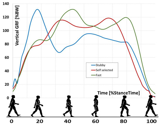 Vertical ground reaction force (vGRF) in three analyzed gaits.