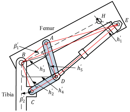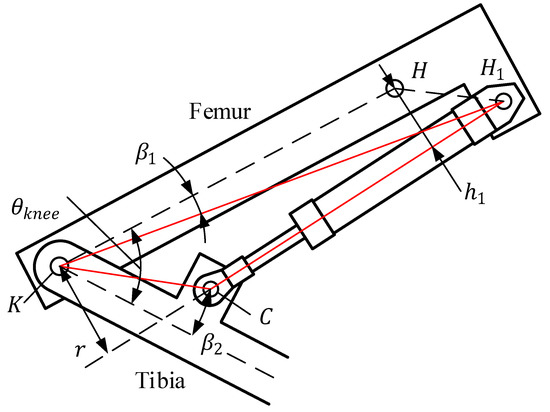 where is the distance between the cylinder axis and the knee joint when the cylinder fully stretches, and are the radius of the knee joint and cylinder rod, and 0.005 is set as the safe distance.