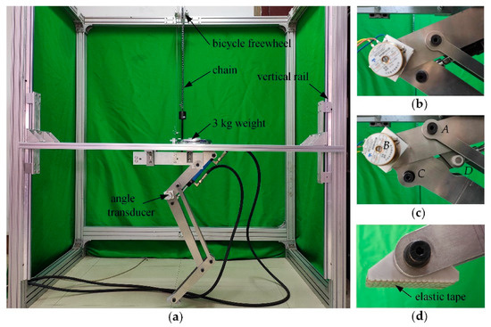 The one-legged robot platform is built to verify the optimization results of the DAG and FMAG, as shown in Figure 4a. The frame () is built by aluminum extrusions (6060). Two cylindrical linear rails (16 mm diameter) are fixed vertically on the frame. Four slide blocks (SBR16) are fixed symmetrically on the horizontal rack. The robot body, the horizontal rack and slide blocks weigh about 7.2 kg in total. Therefore, another 3 kg load is fixed on the rack to match the mass in Table 1. An angular transducer is installed to measure the displacement of the knee joint.