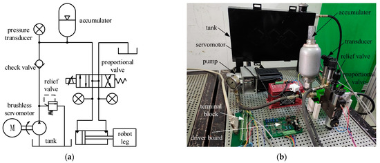 A fixed displacement pump with 2 ml/rev is driven by a brushless servomotor at 800 r/min. The system pressure is set as MPa by the relief valve. To absorb the fluid shock and decrease the instant pressure drop, an accumulator with 0.4 L volume and MPa initial pressure is added to the hydraulic system. The hydraulic circuit is shown in Figure 5. Both pressures in the cylinder two chambers are measured by the pressure transducers. The analogue signals of the knee joint angle and the fluid pressures are fed back to a computer through the data acquisition card (Advantech PCI-1716L).