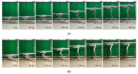 In this subsection, we conduct the hopping experiments to compare the hopping performance of the two attachment geometries. Figure 6 shows the images of the vertical hopping of the one-legged robot under the DAG and FMAG captured by a high-speed camera. The initial picture of the hopping locomotion is chosen when the robot leg has a slight movement. As shown in Figure 6a,b, the take-off phase of the robot under the DAG and FMAG last about 0.3 s and 0.24 s, respectively. And the corresponding hopping heights of the robot body are about 1.122 m and 1.241 m. Therefore, the FMAG can achieve a shorter takeoff time and a higher hopping height. Thanks to the high friction force of the elastic tape at the toe, there is no foot sliding during the take-off phase. The swing of the leg after the take-off phase is mainly caused by the pulling of the pipeline.