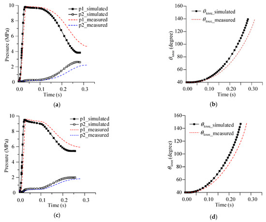 Simulation and experiment results of the cylinder pressures and knee joints under the DAG and FMAG. (a) Cylinder pressures of the DAG; (b) Knee joint angle of the DAG; (c) Cylinder pressures of the FMAG; (d) Knee joint angle of the FMAG.