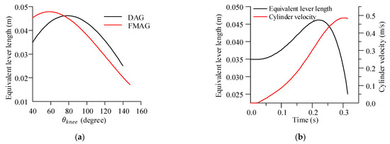 Based on Equation (20), the equivalent lever length can be divided into two stages. In the first stage, both of the angular velocity and the equivalent lever length increase. And the speed of the increment of will accelerate. In the second stage, the equivalent lever length begins to decrease continuously. The decline of can partially offset the increment of . And the speed of the increment of will slow down gradually. Based on the upper optimization results, the equivalent lever lengths of the DAG and FMAG are shown in Figure 8a. The first stage in the DAG accounts for 38.4% of the range of the knee joint, while it is only 16.6% in the FMAG. Moreover, in the second stage, the variation of the equivalent lever length of the FMAG (from 0.0479 m to 0.0171 m) is larger than that of the DAG (from 0.0462 m to 0.0251 m).
