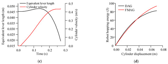 The experiment results of the cylinder velocity and the corresponding equivalent lever length of the DAG and FMAG are shown in Figure 8b,c. The larger initial equivalent lever length under the FMAG causes a quicker increment of the cylinder velocity at the beginning. Benefitting from the low percentage of the first stage, the increment of the cylinder velocity under the FMAG begins to slow down (at about 0.16 s and 0.3 m/s) earlier than that under the DAG (at about 0.23 s and 0.36 m/s). With the decrease of the equivalent lever length, the speed of the cylinder velocity increment decreases continuously. The cylinder velocities both under the DAG and FMAG almost maintain constant at the end of the take-off stage. Due to the larger proportion of the second stage of the equivalent lever length, the final cylinder velocity under the FMAG (0.43 m/s) is smaller than that of the DAG (0.49 m/s). Therefore, the pressure drop under the FMAG is smaller than that under the DAG. And more energy is supplied to the cylinder, resulting in a higher hopping height of the robot body under the FMAG. The robot hopping energy as the sum of the kinetic and potential energy increment is shown in Figure 8d. The final hopping energy under the FMAG (about 93 J) is larger than that of the DAG (about 81 J). Thus, the robot can receive 14.8% more energy under the FMAG.