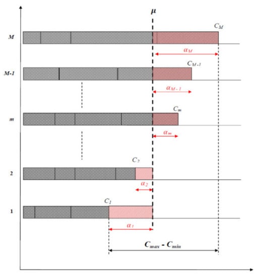 In the case of identical parallel machines, a well-established criterion is the normalized sum of squared workload deviations (). This criterion was introduced by Ho et al. [14]; it is based on the sum of squares principle known in measuring variability in statistics and serves as a precise measurement criterion. is defined as follows.