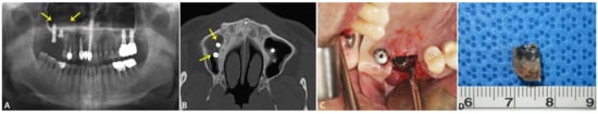 Maxillary sinus lifting and bone grafting procedures are recommended in the maxillary molar area with vertical bone height as much as 5 mm or less to improve the bone quantity and implant osseointegration. Sinus augmentation is highly predictable with many studies reporting over 95% success []. The survival rate of implants placed in sinuses augmented with the lateral window technique varied between 61.7% and 100%, with an average survival rate of 91.8% []. However, during the implantation process in the maxillary posterior region, with or without the sinus lifting procedure, several complications may develop. Perforation of the Schneiderian sinus membrane during the implant installation tends to heal spontaneously [,]; however, cases of odontogenic maxillary sinusitis (OMS) due to implant penetration into the maxillary sinus have been reported []. The incidence of OMS after maxillary sinus lifting is 0% to 20% [,,].