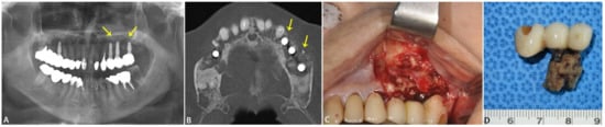 Preoperative radiographic examination of case 2. The panoramic radiograph shows generalized alveolar bone loss and calculi deposition, apical involvement of the #36 tooth; furcation involvement of the #37 tooth; peri-implant bone loss around the #15, #24, #25, and #26 teeth; and left maxillary sinus opacification (marked with arrows) (A). CT imaging showed bone fracture and sequestrum formation in the right and left sides of the maxilla and left mandible. Cortex destruction, sequestrum, calculated marrow attachment, and adjacent bone sclerosis were observed in the areas of #11 to #17, #24 to #27 (marked with arrows), and #36 and #37 teeth, and the upper and lower cortices were overserved, thus lost in the area of maxillary bone destruction in the axial view (B). Intraoperative view of the partial maxillectomy (#25i, #26i, and #27i alveolotomy) surgical procedure. Necrotic bony exposure was observed on the buccal side of the left maxilla (C). The extracted #25i, #26i, and #27i implants with necrotic bone attachment (D).