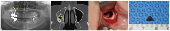 The panoramic radiograph (Figure 1A) and Water’s view revealed generalized alveolar bone loss and calculi deposition, with furcation involvement of the #36, #37, #46, and #47 teeth; a retention pseudocyst in the right maxillary sinus; and mucosal thickening of both sinuses (Figure 1A,B, arrows). Using CT, the #16i implant fixture with missing abutment in the #16i implant area and the mucosal thickening and retention pseudocyst were also observed in the right maxillary sinus (Figure 1B). The surgical treatment for the right maxillary sinusitis and fractured #16i implant included a modified endoscopic-assisted sinus surgery (MESS) [], a novel and an efficient way for approaching the maxillary sinus, irrigation of the sinus to ensure complete removal of the inflammatory tissues and foreign body, and #16i implant removal under conscious sedation (Figure 1C,D). The patient was recommended to quit smoking before operation and stay smoke-free at least 4 weeks after it. Otherwise, the patient did not have any general pathology and underwent uneventful healing postoperation. After complete healing following the surgery, bone grafting was planned in the implant extraction site with the possibility for removal of the #17i implant due to displacement into the maxillary sinus. Six months after the first surgery, the second surgery involving bone graft and #17i implant removal was carried out. The patient displayed uneventful healing upon clinical examination and radiographic examination and, six months after the second surgery, the microplate was removed and an implant installation operation was carried out at the previous implant extraction site using a 4.0 × 8.5 mm Luna® implant (Shinhung Co., Seoul, Korea). During the immediate postoperative examination, improved aeration was observed in the area of the right maxillary sinus.