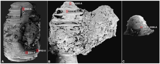 SEM photograph showing the whole implant specimens with the marking of SEM-EDS examined points. In the implant fixture from case 1, the high magnification micrograph and EDS analysis were performed at three points: one in the thread surface to show the fixture morphology (0101-T), one on the attached bone in the upper region (0102-U), and one on the attached bone in the apical region (0103-A), to compare the bone structure and chemical composition at these two regions (A). In implant fixture and attached bone mass from case 2, two points in the apical area of the implant, one on the integrated bone in the middle of the fixture (0204-M), and one on the fixture surface in the apical region (0205-A) were chosen to examine the BRONJ—affected and fungal-infected bone and implant morphology (B). In the implant apex from case 3, the exposed surface of the fixture thread was chosen to be analyzed by EDS (C).
