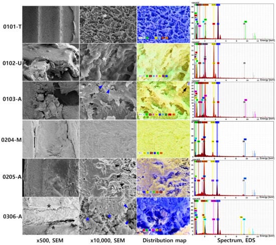 In case 1, the implant fixture was directly related to the mucous retention cyst of the maxillary sinus in the apical region. The high magnification micrograph and EDS analysis were performed at three points: one in the thread surface to show the fixture morphology, one on the attached bone in the upper region, and one on the attached bone in the apical region to compare the bone structure and chemical composition at these two regions (Figure 4A). SEM micrograph of the exposed implant surface revealed the pattern of sandblasting and acid etching surface (Figure 5, 0101-T, white asterisk). EDS analysis of this region showed a homogenous Ti surface covered by a Ti oxide layer (% mass Ti: 82.98%, oxygen (O): 10.93%). In addition, minor signs of carbon (C) and fluorine (F), together with traces of gold (Au), sodium (Na), calcium (Ca), phosphorus (P), and silicon (Si), were recorded. Bone tissue attached at the implant upper part (Figure 5, 0102-U, white asterisk) was found to have a more compact structure than bone in the apical region, per both SEM micrograph analysis and EDS composition results (Figure 5, 0103-A) (% mass of Ca in 0101-T was 35.61% vs. 29.26% in 0103-A). The Ca/P ratio of bone in the upper region was higher than that in the apical region (4.1 vs. 2.6). Noticeably, a significant level of zirconium (Zr) (9.19%) was detected in this upper bone region, together with trace signals of Ti, Na, and Si. The bone at the apical region (Figure 5, 0103-A) exhibited a nonhomogeneous structure, with not only organic particles (Figure 5, 0103-A, blue arrowheads) but also significant signs of Na, Si, Ti, and traces of Au, aluminum (Al), and magnesium (Mg). A Ti particle was also detected and is displayed on the distribution map (Figure 5, 0103-A, distribution map, arrow).