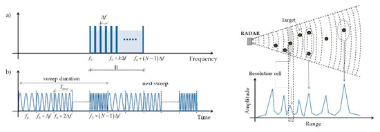 Figure 2. The SF-CW technique in (a) time and (b) frequency domain [34] (left) and the range profile diagram [41]. - The radar interferometry technique: the electromagnetic waves reflected back by moving targets are characterized by a phase shift ∆φ compared to the emitted waves. This phase information can be exploited to detect differential radial displacements along the wave propagation direction. Indeed, radial displacements are proportional to the wave propagation velocity and to the phase shift ∆φ, and inversely proportional to the central frequency of the emitted waves [34].