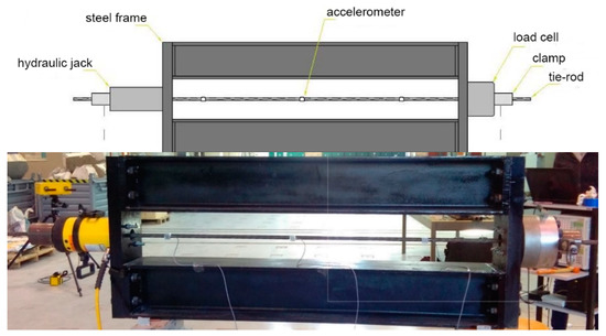 To this aim, a suitable experimental device for applying known tensile forces in rods and cable was built (Figure 3) to reproduce the working conditions of a tie-rod like that employed in masonry constructions. In particular, this device consists of a supporting structure composed of 2 horizontal beams HEA 140 connected by two vertical high stiffness steel plates; a hydraulic jack and two clamping devices for tensioning the tie-rod; a load cell for directly measuring the real value of the tensile force applied. It is worth noticing that the experimental setup was assembled in such a way as to guarantee symmetric constraint conditions at the two ends of the tie-rod.