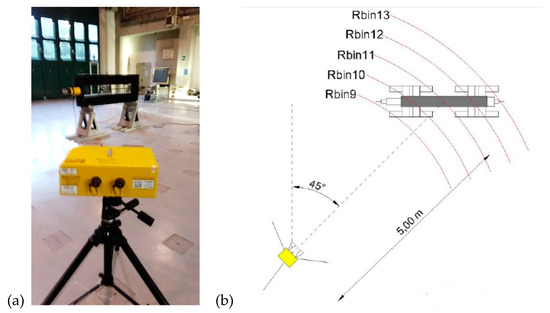 Indeed, to obtain good quality data, the length of the portion of the tie-rod falling into a single range bin should be minimized. On the other hand, there is the need to make as much as possible parallel the radial direction defined by the axis of radar antennas and the direction of transverse displacements of the tie-rod. Therefore, the relative position between the radar and the tie-rod was accurately studied before performing the tests and set in such a way as to be a right balance between the above two requirements, as described by Figure 4a.