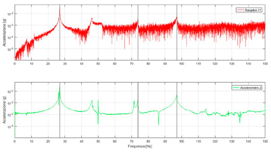 A subsequent test showed that the installation of the corner reflector was effective for acquiring signals really coming from the vibrating tie-rod by the radar interferometer. Indeed, at this point, the frequency domain analysis of accelerometric and interferometric radar data was comparable (see Figure 5, referring to 50 kN applied tensile force). Notice that interferometric radar and accelerometric data were compared in the frequency domain because the locations of the corner reflector on the tie-rod were not coincident with the location of any accelerometer. Moreover, it is worth noting that interferometric radar data (Figure 5, above) are affected by much more noise compared to accelerometric data (Figure 5, below).