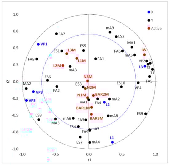 Partial least squares regression (PLSR) analysis, chemical data and the correlation of Chardonnay wines between ageing method and time (t1, chemical components of control wine; t2, chemical components released from wood). CW, N1M, N2M, N3M, L1M, L2M, L3M, BAR1M, BAR2M and BAR3M are the abbreviations for 10 variants of Chardonnay (CW—control wine, N—non-toasted chips, L—light toasted chips, BAR—non-toasted barrel; 1M, 2M and 3M—number of months of ageing). MA1 (iso-butanol), MA2 (isopenthyl), MA3 (2-phenylethanol), mA1 (1-hexanol), mA2 (4-methy-1pentanol), mA3 (E-3-hexenol), mA4 (Z-3-hexenol), mA5 (2-nonanol), mA6 (1-heptanol), mA7 (2,3-butanediol), mA8 (3-methylthio-1-propanol), mA9 (benzyl-alcohol), T1 (linalool), T2 (terpineol), T3 (trans-geraniol), FA1 (iso-butyric acid), FA2 (hexanoic acid), FA3 (isovaleric acid), FA4 (octanoic acid), FA5 (decanoic acid), FA6 (malic acid), FA7 (5-oxotetrahydrofuran-2-carboxilic acid), FA8 (2-oxoapidic), FA9 (lactic acid), ES1 (N-amyl acetate), ES2 (hexyl-acetate), ES3 (ethyl hexanoate), ES4 (ethyl lactate), ES5 (ethyl octanoate), ES6 (phenethyl acetate), ES7 (diethyl malate), ES78 (diethyl succinate), ES9 (tri-methylene acetate), ES10 (ethyl-4-hydroxybutanoate), L1 (butyrolactone), L2 (pantolactone), L3 (3,4-dimethyl-2(5)-furanone), VP1 (p-vinyl guaiacol), VP2 (methyl-hydroxycinamate), VP3 (acetovanillone), VP4 (2,3-hydroxybenzofurane), VP5 (vanillin).