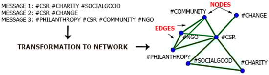 Transformation example of hashtags from messages to the network (case study of corporate social responsibility). Source: reference [14].