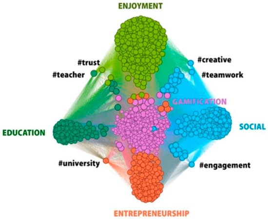 Divided Communities—polarized communities are created for situations where two groups discuss the same topic, but communication between the topics is low. An example is reference [20], which focused on the topic of gamification, and five communities were extracted here, as seen in Figure 5.